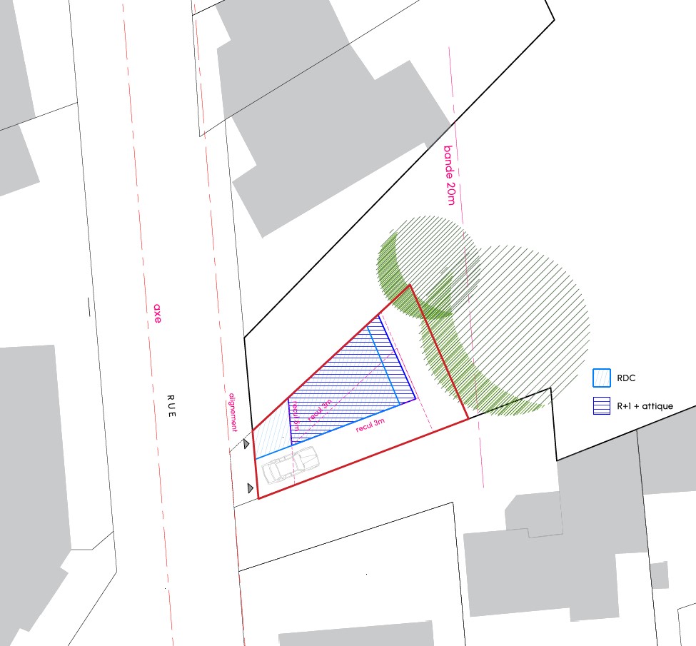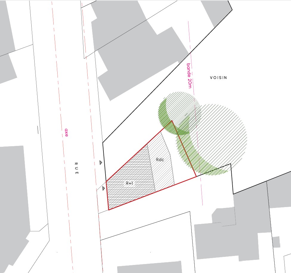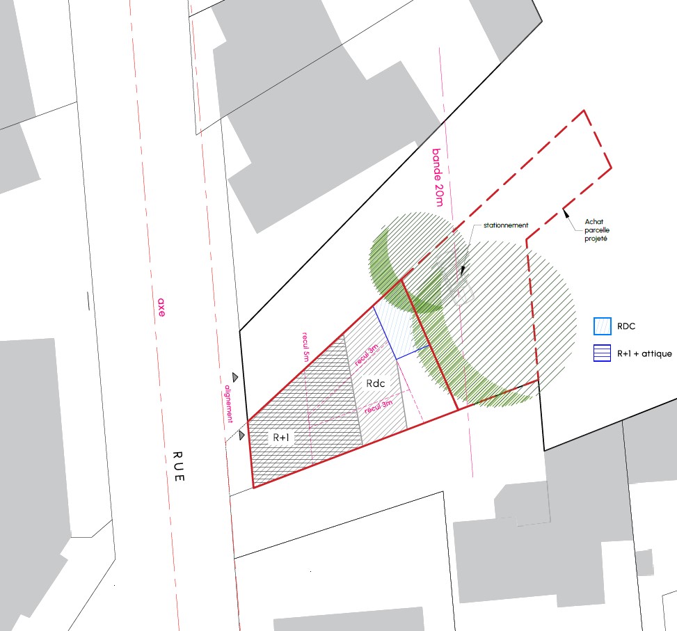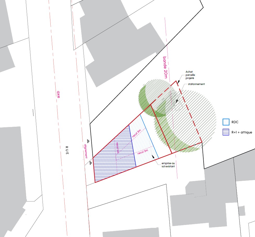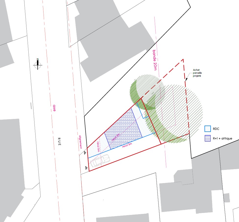 La parcelle est particulièrement étroite, ne possède pas de stationnement et l’espace de vie leur est trop étroit. Pour répondre à ces besoins, il est envisagé d’acheter une surface de terrain au propriétaire voisin.